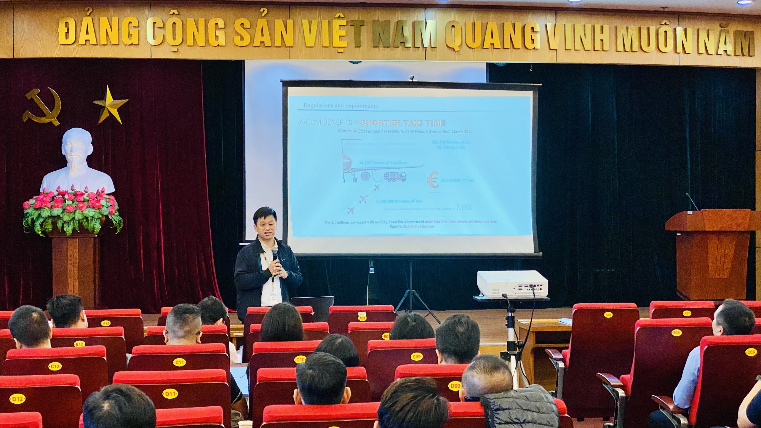 4/6/2023 1:55 PM 848766 Ảnh 3 - Ông Đinh Đăng Định - PGĐ Trung tâm ĐHSB - Cảng HKQT Nội Bài đang giới thiệu về A-CDM tại màn hình A-CDM portal.jpg
